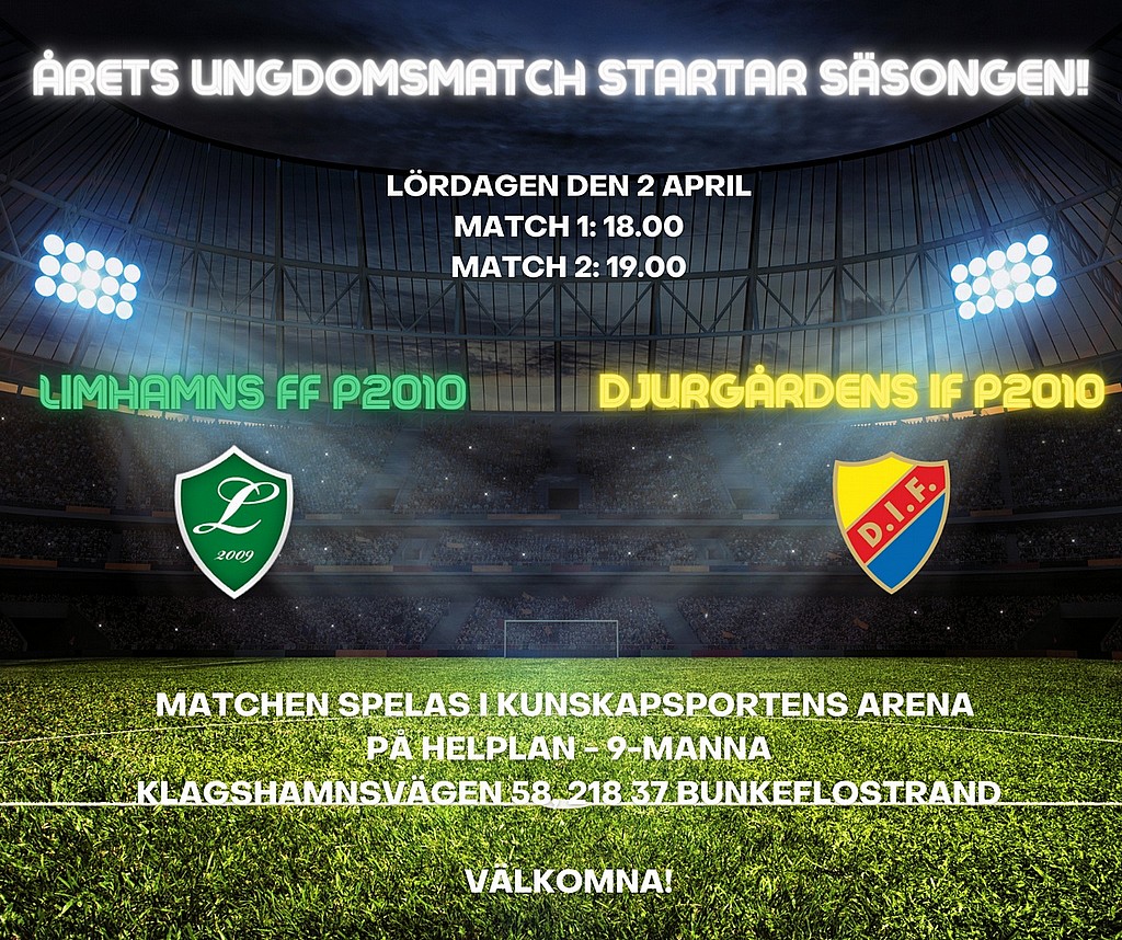 Missa inte årets ungdomsmatch när Limhamns FFs P2010 möter Djurgården IF P2010 i 9-manna match!Matcherna spelas i Kunskapsportens arena på lördag den 2 april mellan 18.00 - 20.00VÄLKOMNA!
